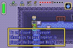 Ressortez de cette salle, plongez dans l'eau et prenez l'échelle cassée sur votre gauche. Sautez dans l'eau et dirigez-vous vers l'escalier qui se trouve vers la gauche. Tuez les ennemis à l'aide des pots...car lorsque vous tirez avec l'épée, le carré jaune situé au centre vous tire des missiles....Descendez le petit escalier. Passez la porte en face de vous, cassez le pot et prenez cette nouvelle clé !! Revenez sur vos pas jusqu'à la salle d'eau principale. Descendez le petit escalier et allez au Sud de la pièce. Faites le tour en suivant votre chemin, poussez le bloc qui obstrue le passage, un coffre apparait, vous y trouvez la boussole (photo ci-dessus à droite). Revenez dans la salle d'eau principale et allez au Nord de cette zone. Il y a une porte vérouillée. Passez-là ! Donnez un coup d'épée sur le déclencheur pour abaisser les blocs bleus et actionnez le levier (photo ci-dessous à gauche).