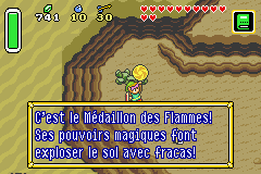 Pour le tuer, utilisez le grappin pour attraper une à une les boules orange. Puis tuez-les avec l'épée. Lorsqu'il n'y a plus de petites boules autour de lui, le boss va commencer à sauter...Bougez pour qu'il ne vous tombe pas dessus !!! et quand il s'approche finissez de le tuer avec votre épée !! Vous obtenez un quart de coeur et délivrez la 2ème des 7 filles. En sortant du Palais, dirigez-vous vers la gauche, jusqu'à une rangée de rondins (photos ci-dessous), utilisez le miroir à cet endroit pour changer de monde. Alllez jusqu'à la stèle sur la gauche, utilisez le livre et levez Excalibur, vous gagnez le médaillon des flammes !!!