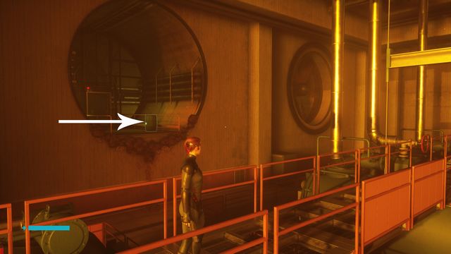 Faites le tour et détruisez-les toutes, vous en avez 5 à détruire. Regardez au plafond au-dessus de la passerelle centrale suspendue (photo ci-dessous à gauche). Le plus dur à trouver est celui indiqué sur la photo (photo ci-dessous à droite).