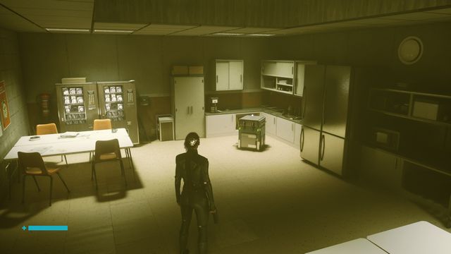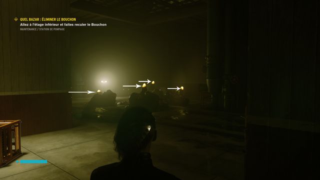 Dirigez-vous vers le distributeur jaune (photo ci-dessous à gauche). Appuyez dessus, la machine disparaît. Suivez-la dans le noir. Suivez ensuite les projecteurs au sol, vous arriverez à un cadavre (photo ci-dessous à droite). Touchez le