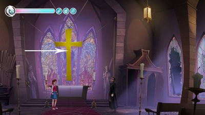 Cliquez sur la porte du garage, ce sera la cachette pour éviter Trenzor (photo ci-dessous à gauche). Allez à l'église puis utilisez "le toucher d'or du roi Midas" sur la croix. Vous la transformez en or (photo