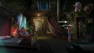 Cliquez sur le cactus pour rejoindre la fenêtre tout en haut du manoir. Cliquez sur le buste à droite (photo ci-dessous à gauche) puis cliquez sur le chapeau du buste. Vous récupérez le chapeau