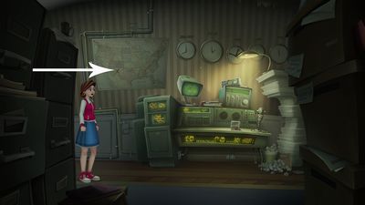 Cliquez sur la carte des Etats-Unis au mur (photo ci-dessous à gauche). Elle met en valeur le lieu de "Corona". Partez pour le garage de Linda. Cliquez sur la voiture rose à l'intérieur du garage (photo ci-dessous