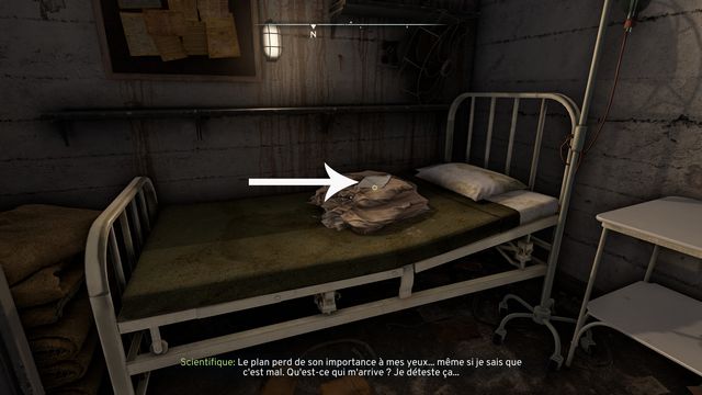 Vous rencontrez un scientifique à l'article de la mort. Ce dernier vous demande un bandage. Pour faire un bandage, il vous faut de l'alcool et du tissu. Faites le tour du bunker où vous êtes pour en trouver