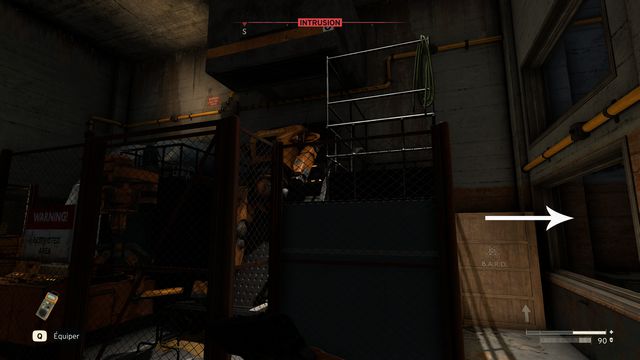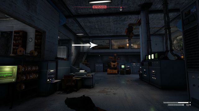 Traversez la cuisine et rejoignez la salle d'administration à l'étage (photo ci-dessous à gauche). Passez par le trou (photo ci-dessous à droite).