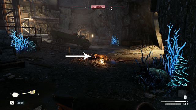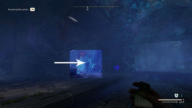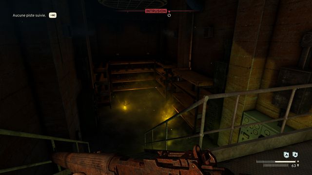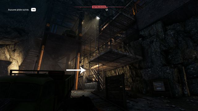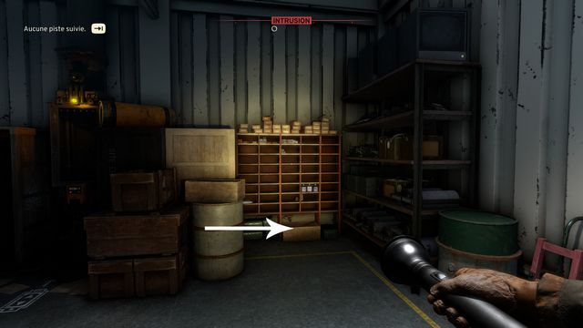 Descendez l'échelle pour y accéder puis cliquez sur le document sur la caisse (photo ci-dessous à gauche). Vous obtenez l'indice "Robotique / Approvisionnement en obérite". En bas de l'escalier, vous voyez du