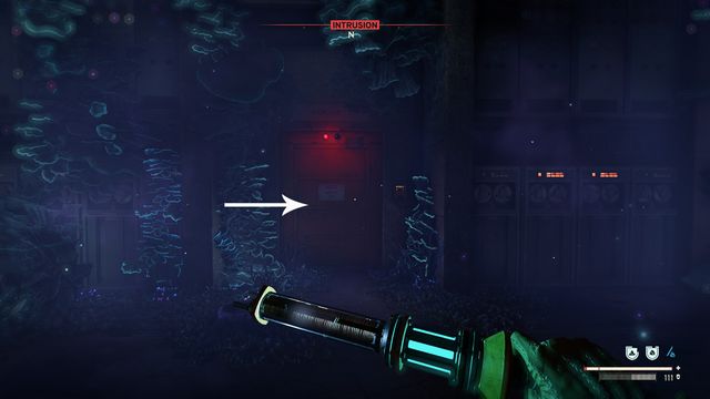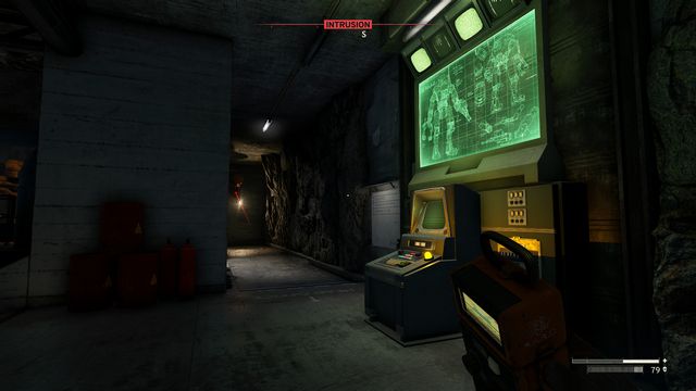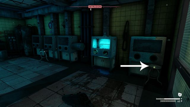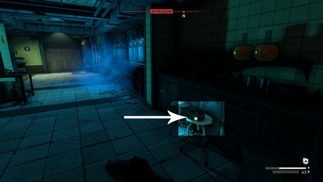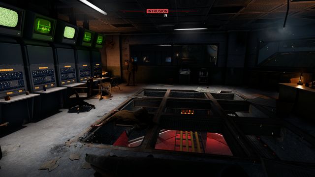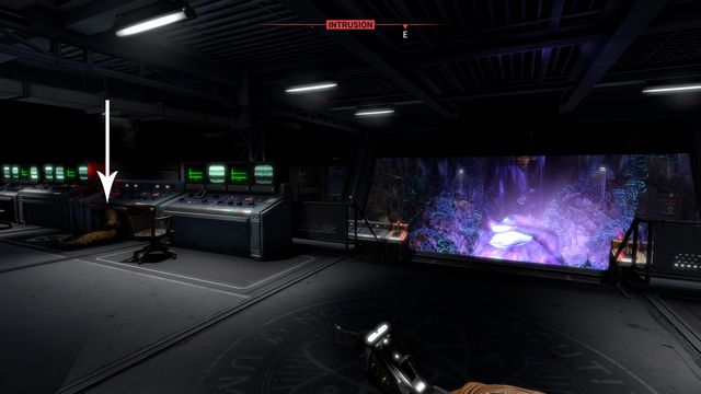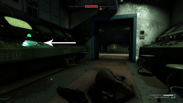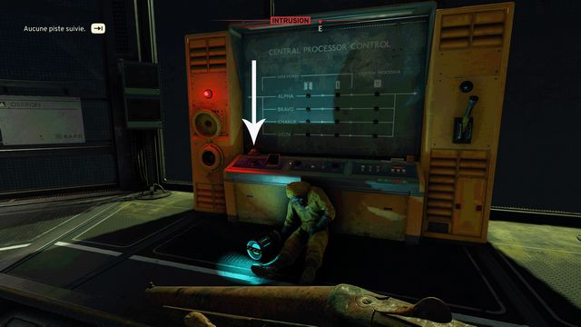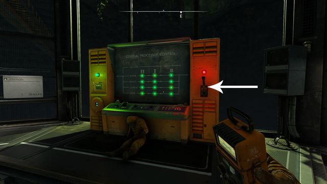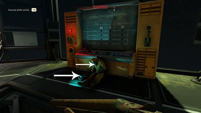 En entrant, allez tout droit, direction "Central processor". Utilisez la carte du scientifique sur le boitier d'accès (photo ci-dessous à gauche). Approchez-vous du scientifique mort puis décrochez le téléphone.