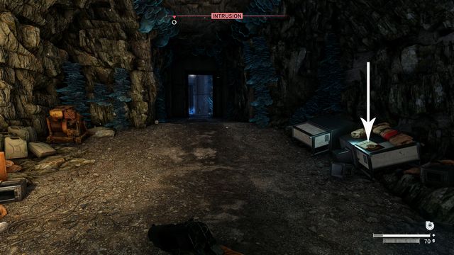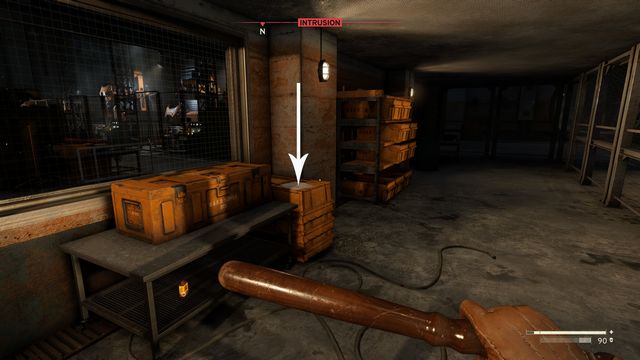 Déverrouillez la grille puis redescendez pour trouver la réserve (photo ci-dessous). Vous trouvez à l'intérieur, un stimulant de combat, un manuel de compétences pour la survie : "Fabrication d'armes",