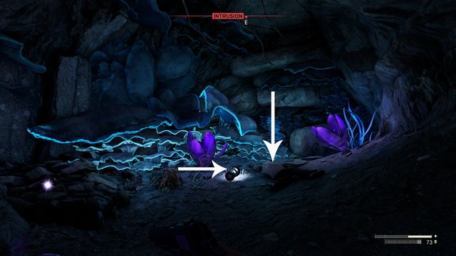 Allez désactiver la mitrailleuse à droite puis récupérez l'indice de quête sur le bureau à proximité "Robotique / L'exploitation de l'artefact a été interrompu" (photo ci-dessous à gauche). Eliminez les 2 robots