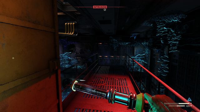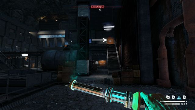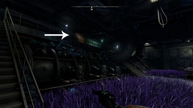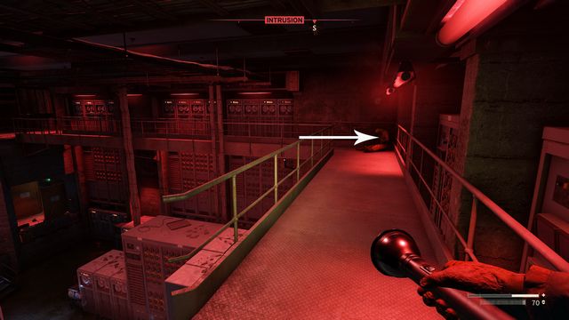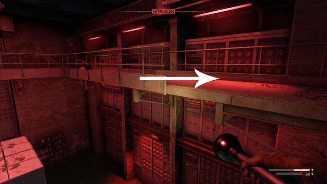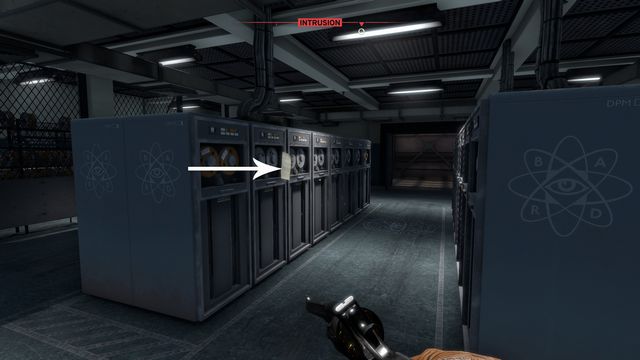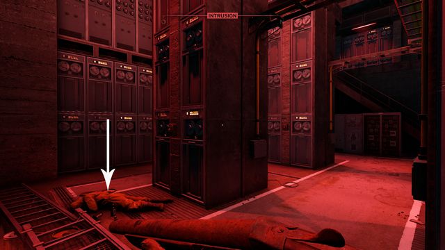 Sautez sur les armoires électriques pour rejoindre la passerelle en hauteur (photo ci-dessous à gauche). Fouillez le cadavre, vous obtenez "la clé de la réserve de la banque de données Delta" (photo ci-dessous à