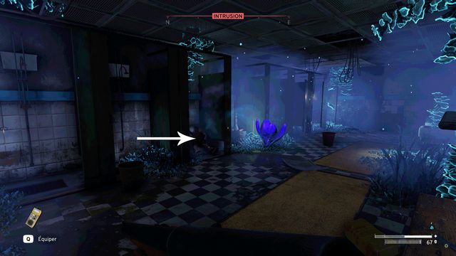 Vous ouvrez la porte vers l'auditorium (photo ci-dessous à gauche). Traversez l'amphi et faites attention au gaz bleu, il fait des dégâts. Prenez rapidement "l'échantillon n°1" à côté du cadavre (photo ci-dessous
