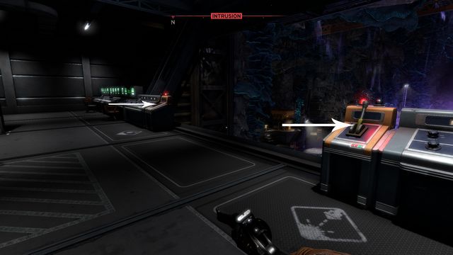 Actionnez le levier sur le panneau de commande (photo ci-dessous à gauche). Le sol est électrisé. Allez à l'étage, rapprochez-vous du relais (photo ci-dessous à droite) et utilisez le redirecteur de signal dessus.