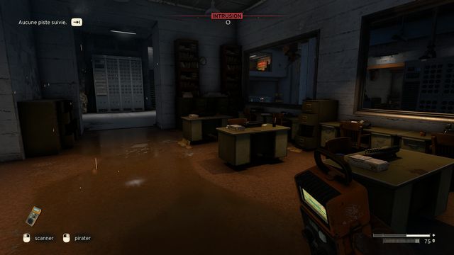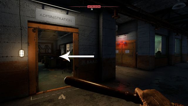 Passez la 2ème porte et descendez les escaliers en fer. Entrez dans le bureau suivant (photo ci-dessous à gauche) et récupérez l'indice de quête "Stimulant de croissance / Elle a volé le stimulant et s'est enfuie