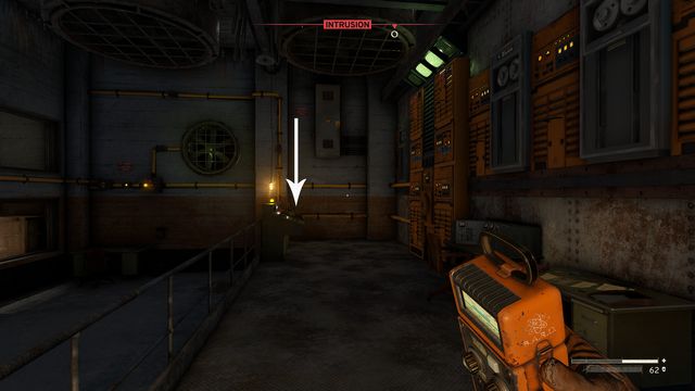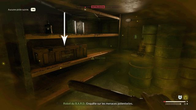 Vous trouverez un indice de quête "Documents du B.A.R.D. / Quelque chose est enfoui ici" dans la caisse suivante (photo ci-dessous à gauche). Rejoignez le réacteur et récupérez l'indice de quête au sol "Oberon /