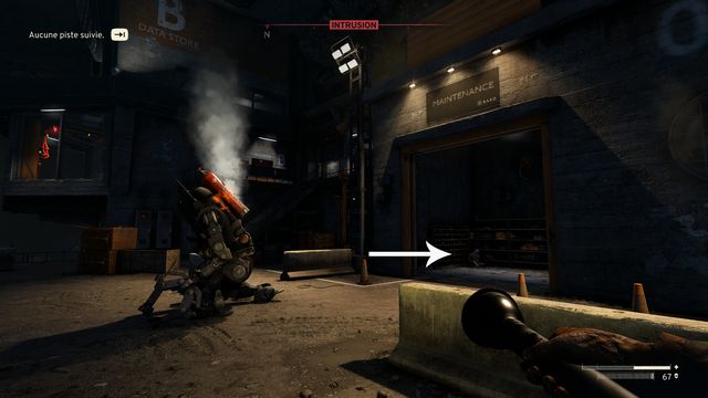 Vous débloquez l'accès au "Centre de robotique". Rejoignez-le et courez directement vers la porte pour éviter le robot. Pour vous en débarrassez, tirez dans la tête jusqu'à ce qu'il passe en surchauffe. Allez derrière