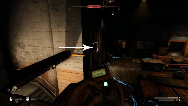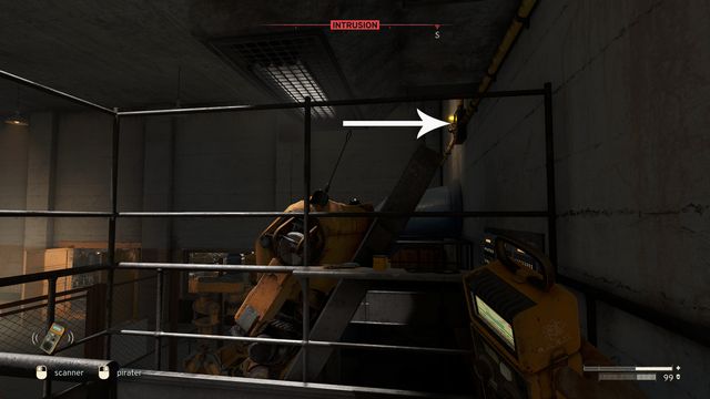 Descendez tout en bas, la porte d'accès n'est pas alimentée. Utilisez le redirecteur de signal pour l'ouvrir (photo ci-dessous à gauche). Profitez-en pour fouiller le corps du scientifique, vous trouverez sur