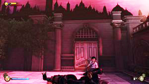 Récupérez le voxophone à droite en entrant, sur le siège. Traversez la place de la fontaine. Vous arrivez à une grille, seule Elizabeth peut traverser. Elle ouvre une faille et vous apercevez au-dessus de vous un