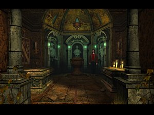 Vous remplissez la théière puis votre flacon vide. Retournez à l'intérieur de la maison et posez la théière sur le poêle pour faire rechauffer l'eau. La bouilloire se met à boullir au bout de quelques secondes. Associez le stylo avec le flacon plein d'eau. Vous videz l'encre dans le flacon et vous obtenez un flacon d'encre dilluée. Prenez les débris de verre que vous avez ramassé dans le laboratoire puis utilisez-les sur la vapeur qui s'échappe de la théière. Vous décollez l'étiquette. Associez l'étiquette avec le tube de colle puis l'étiquette encollée sur le flacon d'encre dilluée puis allez donner le flacon au professeur. Voilà, vous venez de faire de l'oxydant EX52...Parlez au professeur et demandez-lui de chercher à quoi corresponde les noms sur les statues dans le caveau puis ressortez de la maison abandonnée. Il faudra demander 4 ou 5 fois à Richard s'il a décrypté les codes avant qu'il vous dise que les noms correspondent à des dieux. Parlez-lui ensuite du sang, le professeur vous dit de prendre le flacon dans le réfrigirateur. Ressortez du laboratoire, reprenez la bouilloire qui maintenant est froide puis sortez de la maison abandonnée. Allez tout droit dans la chappelle puis utilisez le flacon de sang sur la statue à gauche. Utilisez la bouilloire sur la statue à droite. Vous voyez les statues qui s'allument. Ressortez du caveau puis prenez de la terre dans le petit pot à terre (photoc i-dessus à droite). Retournez dans le caveau puis placez la terre dans la balance de la statue d'en face. Les 3 statues sont allumées et un autel apparaît au milieu (photo ci-dessous à gauche).