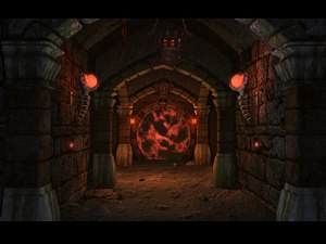 Utilisez la carte avec la bougie. Certains murs sont plus éclairés que d'autres (photo ci-dessus à droite). Les murs qui s'allument sur la carte sont les lampes que vous devez allumées et qui sont accrochées sur ces même murs...Une fois toutes les lampes allumées, la tête de monstre s'enlève et fait place à un téléporteur à la "Stargate"...(photo ci-dessous à gauche).