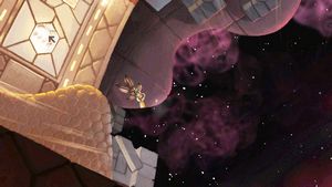 refuse de vous y envoyer. Choisissez alors de vous envoyer à l'amas du confort puis descendez l'échelle à droite du Tisse-espace (photo ci-dessous à gauche). Utilisez le crochet sur la toile pour faire apparaître les