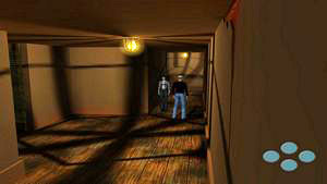 Tournez à gauche au fond et cliquez sur la poignée, à gauche, sur le mur (photo ci-dessous à gauche). Descendez les escaliers, vous entendez des coups de feu. Revenez au couloir principal puis entrez dans la 1ère