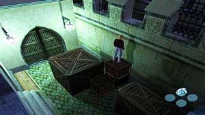 Vous vous retrouvez dans la peau de George. Allez chercher la caisse au fond et ramenez-la le long du mur (photo ci-dessous à gauche). Grimpez sur le mur pour rejoindre l'escalier. La porte au fond est fermée. Sautez