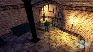 Faites le tour par la porte, placez-vous derrière le chariot et cliquez dessus. Ce dernier défonce la porte. Avancez dans le tunnel et tournez à la 2ème sur votre droite. Allez tout droit, vous découvrez une porte