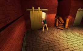 Cliquer sur la petite fenêtre pour espionner les mafiosos. Revenez dans la salle où il y a les 2 cochons suspendus puis allez jusqu'à la porte où le rideau de fer était fermé (photo ci-dessous à gauche). Le rideau est