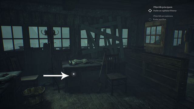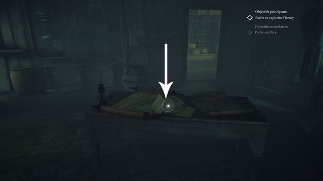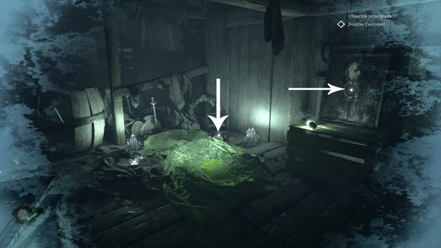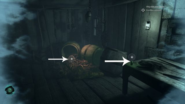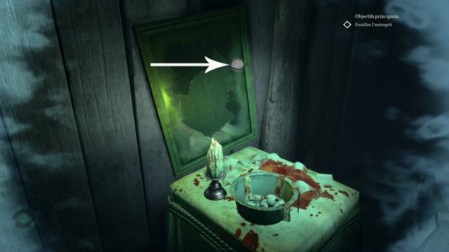 Examinez le flacon de médecine légal sur la table et la viande au sol (photo ci-dessous à gauche). Examinez ensuite le flacon pour insomnies et le journal sur les caisses en bois (photo ci-dessous à droite).