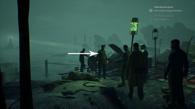 Sortez sur le balcon et parlez au Capitaine. Epuisez tous les dialogues avec lui. Rejoignez le groupe de pêcheur et parlez au policier (photo ci-dessous). Il ne veut pas vous répondre. Examinez les blessures