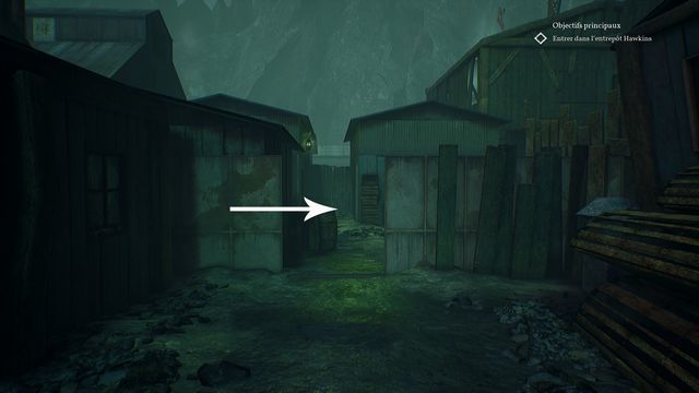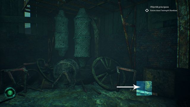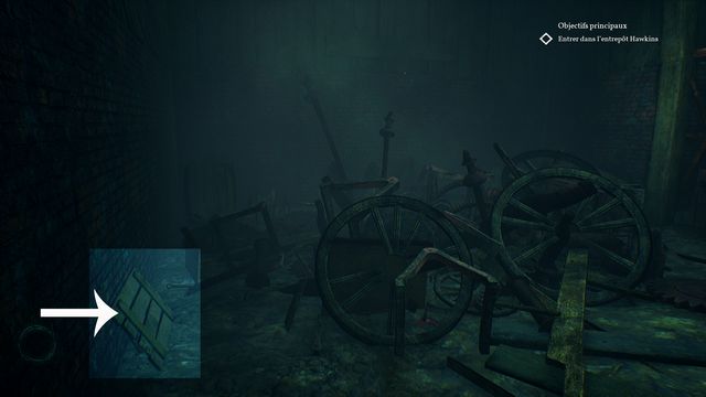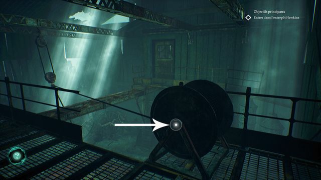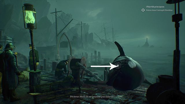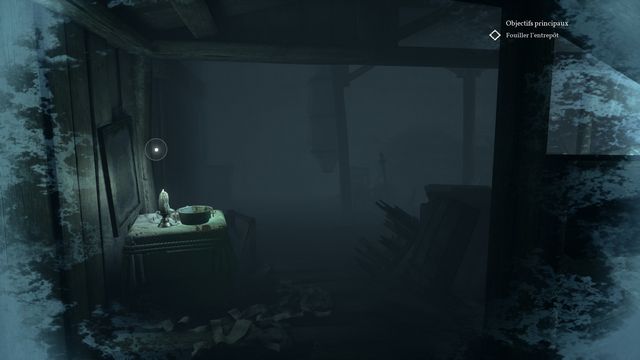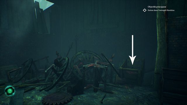 Examinez la vertèbre de baleine au sol (photo ci-dessous à gauche). Continuez de faire le tour, allumez votre briquet puis récupérez le rouage au sol planqué derrière les planches (photo ci-dessous à droite).