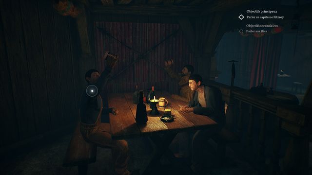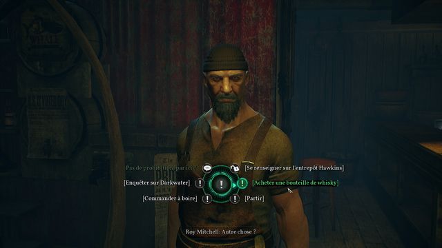 Retournez au bar "La baleine échouée" puis parlez au barman. Achetez-lui une bouteille de whisky (photo ci-dessous à gauche). Allez donner la bouteille de whisky aux pêcheurs (photo ci-dessous à droite).