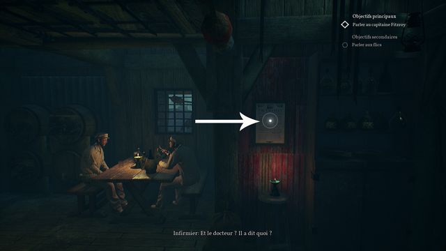 Entrez dans le bar "La baleine échouée" (photo ci-dessous à gauche). Excusez-vous puis épuisez les dialogues avec le barman Roy Mitchell. Examinez l'affiche au mur (photo ci-dessous à droite).