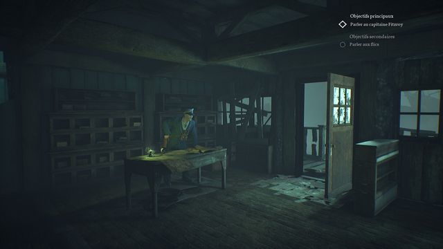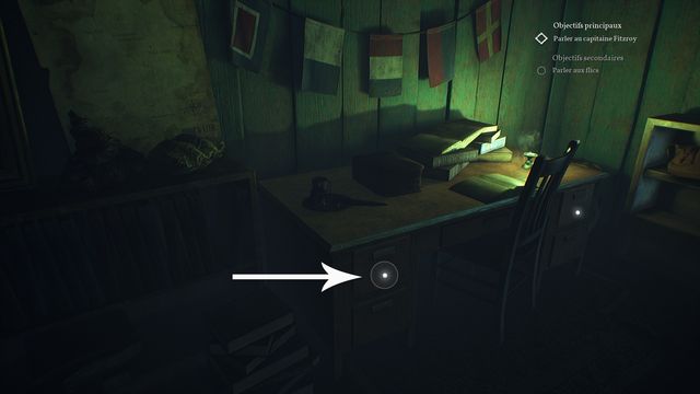 Allez à l'étage et fouillez le tiroir de gauche du bureau (photo ci-dessous à gauche). Vous récupérez "la photographie du Capitaine Fitzroy". Redescendez, examinez le tiroir de gauche du bureau suivant (photo