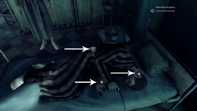 Vous vous retrouvez à l'infirmerie. Décidez d'ausculter le patient dans les dialogues et examinez sa main, sa tête et le côté droit de l'abdomen (photo ci-dessous). Le Docteur Fuller arrive, épuisez