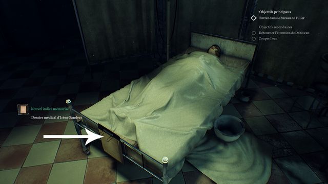Examinez tous les patients de la pièce. Vous y trouverez Irène Sanders. Lisez son dossier médical accroché au lit (photo ci-dessous à gauche). Vous obtenez l'indice "Dossier médical d'Irène Sanders". Examinez