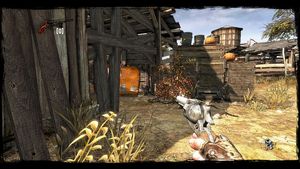 l'étable. Pour éliminer certains ennemis en masse, tirez sur les barils rouges explosifs. Rejoignez l'épouvantail à droite de l'écurie (photo ci-dessous à droite). Cliquez sur le chapeau accroché au bras de gauche.