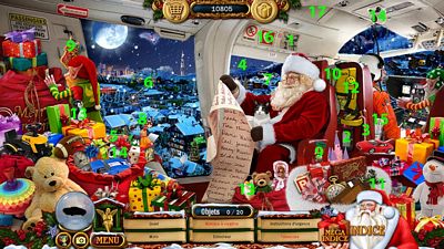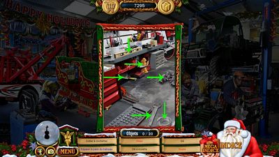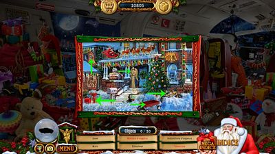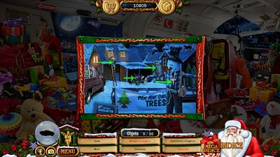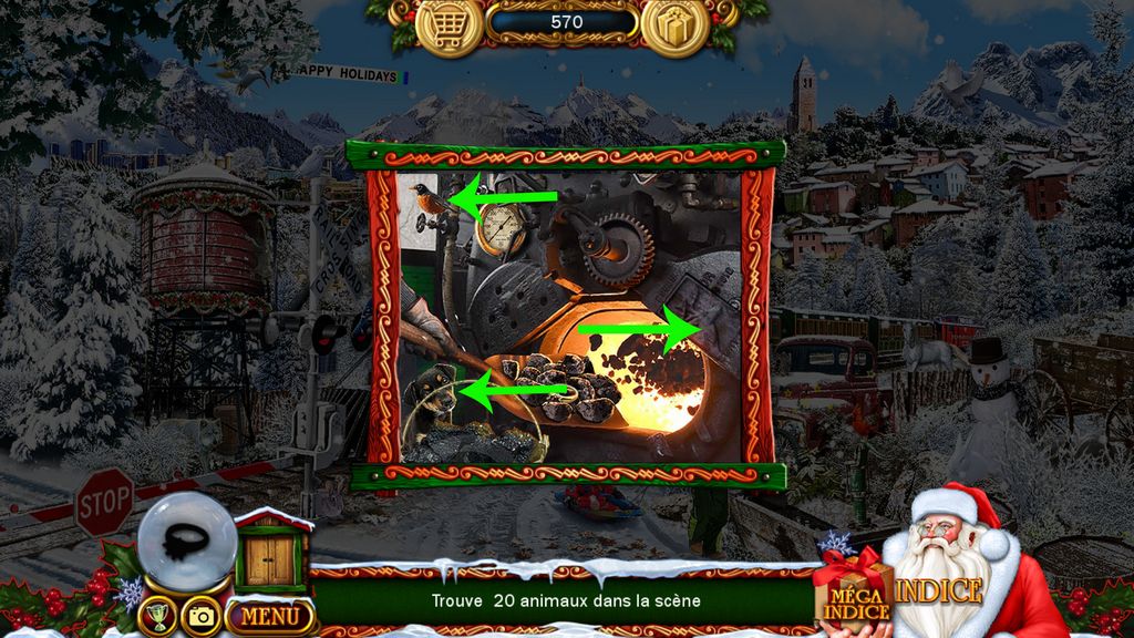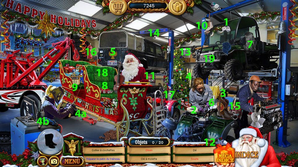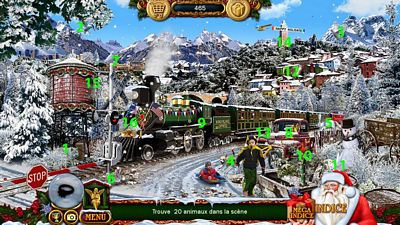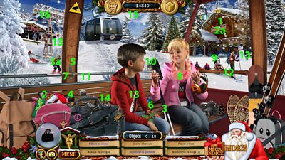 1. Dans la scène secondaire du traîneau : 4 animaux à trouver. Cliquez au point 1 (sac de jouet), vous y trouverez un pingouin