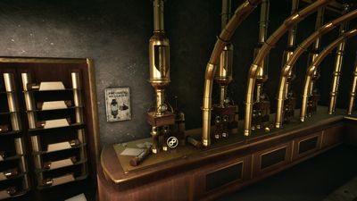 Entrez dans la cabine suivante (photo ci-dessous à gauche). Actionnez le levier à gauche (photo ci-dessous à droite) et lisez la note sur le bureau.