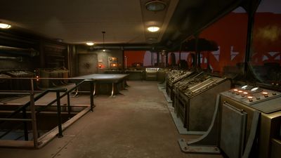Passez la porte un peu plus loin, longez la grande passerelle en fer puis entrez dans la salle suivante (photo ci-dessous à gauche). Montez l'escalier en fer, vous arrivez au poste de commande (photo ci-dessous à