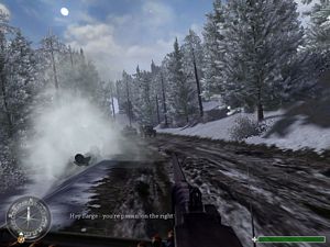 Défendez le barrage jusqu' à l'arrivé du tank ennemi puis enfuyez-vous vers la jeep (celle d'ou vous débutez la mission). Allez à l'arrière de la jeep, une main apparait (photo ci-dessous à gauche). Appuyez sur la touche "utiliser" pour monter à l'arrière. Pour tous les véhicules le principe est le même.