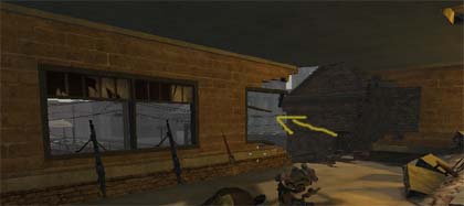 Vous vous retrouvez, de nouveau, sur la passerelle en fer. Traversez-la puis allez à droite. Sautez en contre-bas et allez dans les ruines sur votre gauche. Entrez. Vous avez une mitrailleuse automatique en face de vous, servez-vous en pour tuer tous les ennemis qui arrivent. Allez ensuite tout au fond, sur votre gauche (vous passerez une mitrailleuse automatique...), traversez la nouvelle tranchée (photo ci-dessous)