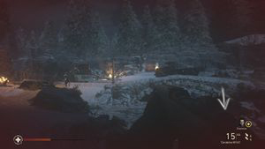 Après le 2ème entrepôt, vous trouverez un chemin qui part dans la montagne sur la droite (photo ci-dessous à gauche). Allez jusqu'à la caisse de munitions et restez en planque. Pierson arrive avec le camion et