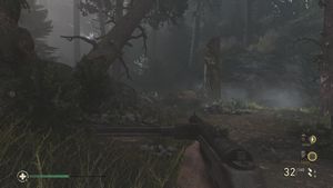 Suivez votre escouade à la poursuite des soldats allemands. Lorsque vous entendez les premiers coups de canon, suivez votre escouade. Vous êtes éjecter un peu plus loin et vous vous retrouvez avec pour seule arme, un