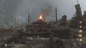 une fois que la zone est dégagée puis allez abattre le char ennemi (photo ci-dessous). Une fois détruit, retournez à l'arrière du pont rejoindre votre escouade. Suivez l'escouade jusqu'au camp ennemi.