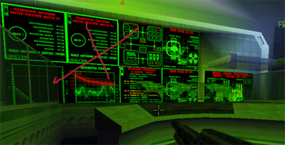Montez encore d'un étage ! Un chrono se déclenche, vous avez 20 minutes pour trouver la carte d'accès et couper le fuel. Allez sur le toit et entrez dans le bâtiment, vous arriverez dans la salle des ordinateurs (photo ci-dessous)