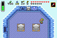 Tirez sur la langue de la statue pour ouvrir la porte de droite et allez -y ! Prenez l'escalier dans la salle suivante et allez ouvrir le coffre. Vous y trouvez la grande clé !!! Redescendez les 2 escaliers. Vous vous retrouvez dans la salle avec les piques, retraversez-les et allez ouvrir la porte de gauche. Allez tout droit. Prenez l'escalier qui se trouve en bas à gauche de la pièce. Détruisez les 2 monstres de glace avec la baguette de feu, un coffre apparait. Prenez-y les bombes. Le sol est fissuré, placez une bombe au dessus de l'escalier, un trou va se former. Sautez !!! Ouvrez le grand coffre, vous y trouvez la cotte de mailles !!! (photo ci-dessus à droite). Poussez le bloc central et celui du haut pour sortir de la pièce par la porte de droite. Dans cette pièce, Tuez le monstre de glace et allez ouvrir la porte au Nord qui est vérouillée. Tuez les petites boules rouges et le squelette puis ouvrez la porte au Nord. Allez tout en bas et tuez les ennemis dans la salle suivante. Ouvrez la porte vérouillée à droite et allez donner un coup d'épée sur le déclencheur rouge. Revenez sur vos pas et reprenez l'escalier (photo ci-dessous).