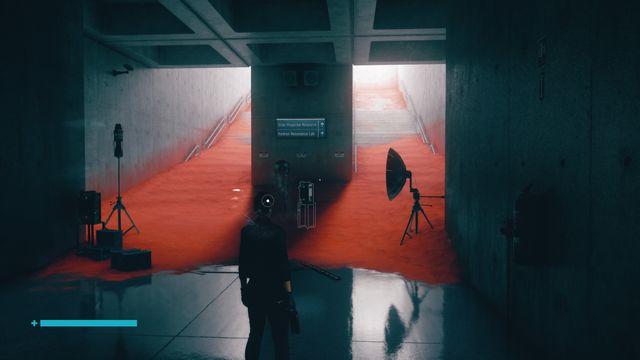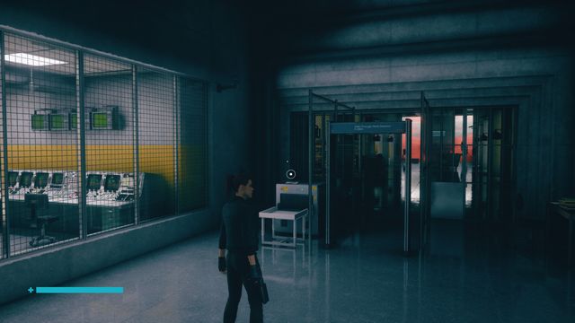 Vous arrivez à la salle des commandes. Appuyez sur le bouton rouge (photo ci-dessous à gauche). Vous entrez dans la salle du projecteur. Passez par la porte en face et dirigez-vous vers "Hedron Resonance Lab". Vous arrivez à une salle de