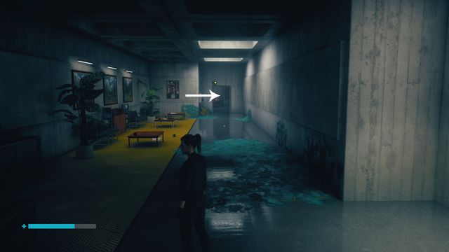 A la sortie de l'ascenseur, rejoignez le bureau au fond et récupérez la 1ère bande (photo ci-dessous à gauche). Revenez jusqu'au point de contrôle et passez la porte en haut des escaliers (photo ci-dessous à droite).