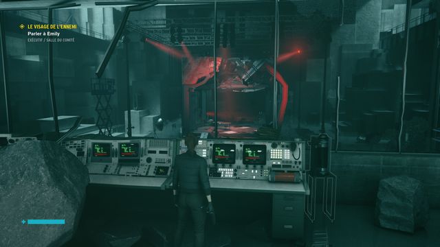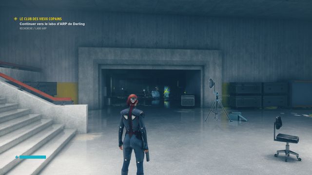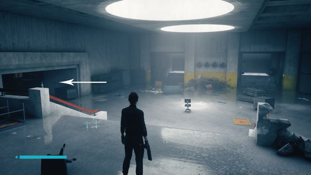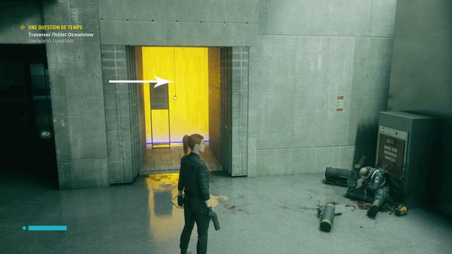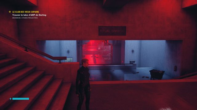 Ressortez du bureau de Marshall par la 2ème porte (photo ci-dessous à gauche). Dirigez-vous vers la zone rouge (photo ci-dessous à droite).